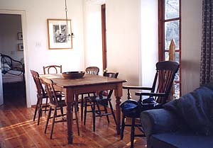 Ground floor | Large living room with sofa and armchairs. Electric heater. Woodburning stove (heats radiators) Kitchen well equiped area with propane gas cooker (4 rings, grill, oven), larder fridge with icebox, toaster. Dining area with large wooden table and chairs to seat six. Bedroom 1 with single bed and door to garden with single duvet and pillows Large bathroom with shower, handbasin, WC. |